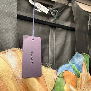 This stunning Prada dress is crafted from 100% silk and features a beautiful multicolored butterfly wing print.