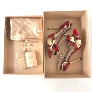 Prada S2012 Flame Red Patent Leather Bow Hotrod Strappy Heeled Sandals 36.5