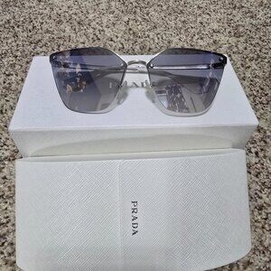 Genuine Prada SPR68T Sunglasses. Silver frames with gradient lenses. I have only worn these a few times and examined them carefully...there are no scratches on the lenses and they are in excellent condition. White case included. Please note that the corner of the outer box is torn.