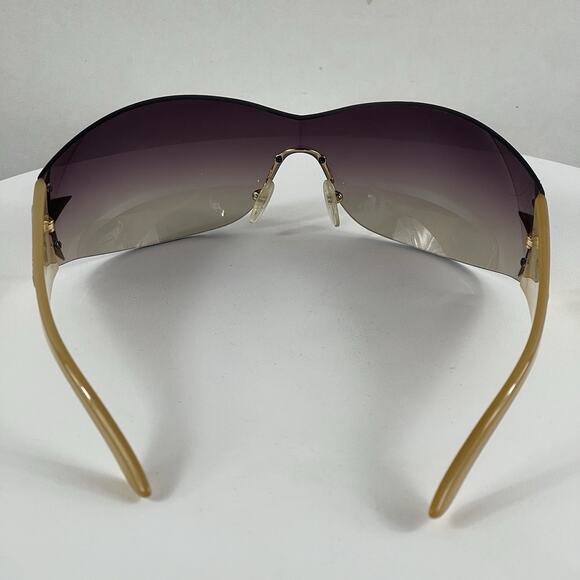 Rimless shield sunglasses from Prada. Frames in camel (beige) colour, purple tinted lens.