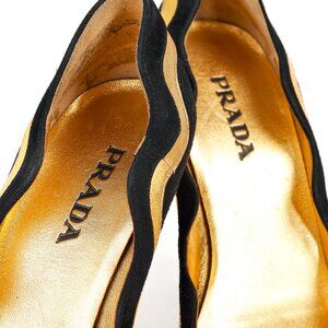 These heels from Prada's 2008 Spring and Summer collection are crafted in a black suede with metallic gold leather accents, and feature covered stiletto high heels, closed almond toes, a scalloped topline with a wavy stripe, and leather lining and soles.