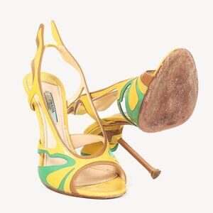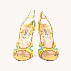 Styled on the designs of classic 1950's American cars, these heeled sandals from Prada's 2012 Spring and Summer collection are crafted in a patent leather of yellow, teal green, and brown hues, and feature covered high heels, open almond toes, cutout detailing, an elasticized slingback strap, geometric appliques at the back, and leather lining and soles.