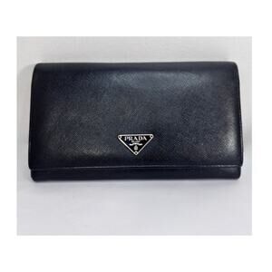 Elegant and timeless Prada Saffiano Leather Continental Wallet in classic Nero black. Crafted in Italy from Prada’s signature crosshatch Saffiano calf leather, this piece embodies understated luxury and durability. Features the iconic enamel triangle “PRADA MILANO” logo, silver-tone hardware, and a structured flap-top design.