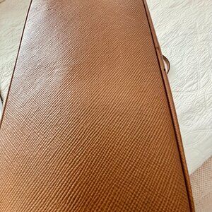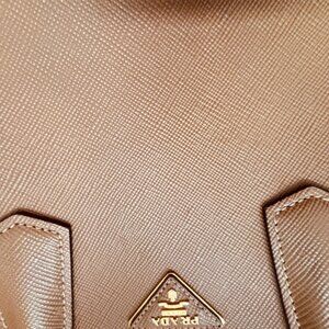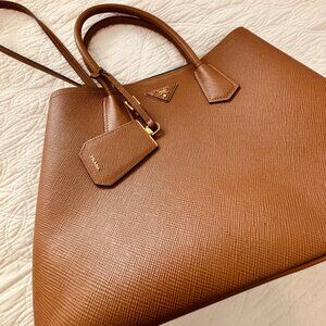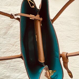 Prada Saffiano Leather Double Handle Tote Handbag Tan/Aquablue