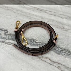Polished gold hardware, leather hanging ID tag and expandable snap sides. Bottom feet.