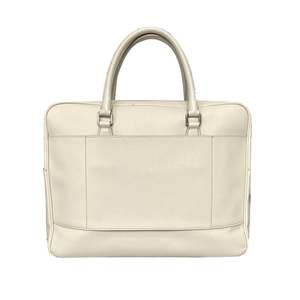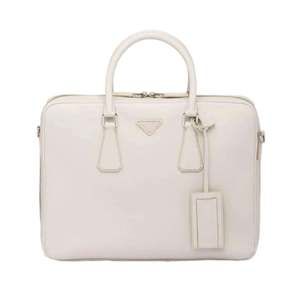 Prada's Saffiano leather work bag in ivory is a sleek briefcase equipped with double handles, a detachable and adjustable shoulder strap, and a detachable tag. Fastened with a zipper closure, it opens up to a brown nylon lining with saffiano leather trim. The spacious interior features two zipper pockets, double patch pockets, and pen holders. Elevate your look when you're on the go with this classic briefcase from Prada.