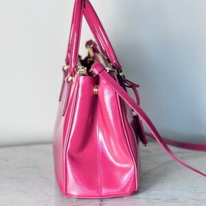 This exquisite Prada satchel in a vibrant pink hue is pure perfection. Structured design with dual top handles. The bag's sleek finish and detachable shoulder strap make it a versatile accessory.
