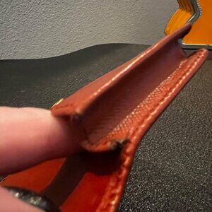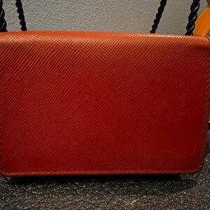 Elegant and compact, this authentic Prada Saffiano Metal card holder doubles as a mini crossbody. Crafted in rich cognac Saffiano leather with gold-tone logo hardware and a secure snap closure. The interior is clean and neatly lined, perfect for cards and small essentials.
