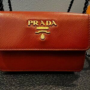 Prada Saffiano Leather Card Holder Wallet on Chain Brown Gold Logo Made in Italy