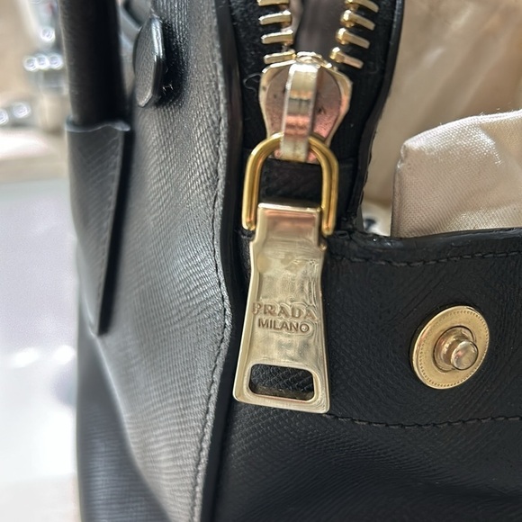 Prada bag with double handle in luxurious Saffiano leather. Black with pale gold hardware. The bag can be held in the hand, worn cross-body, or over the shoulder thanks to the long, fully detachable adjustable strap.