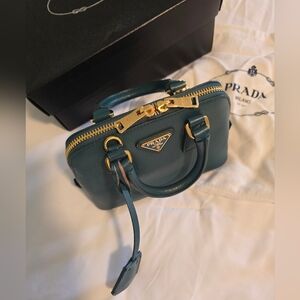 Authentic Prada Saffiano Lux Mini Promenade Bag in teal with gold-tone hardware.