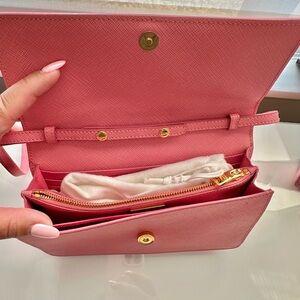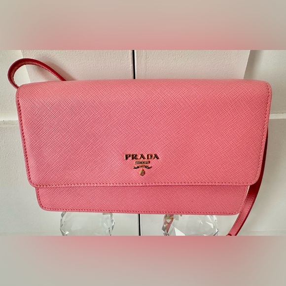 Prada Saffiano Crossbody Bubble Pink adjustable crossbody bag. Larger than wallet on Chain but can be like a wallet small crossbody. Fits your smartphones in nearly all sizes (iPhone 14 pro max fits) has multiple credit card slots, pocket in front and center coin zip. This was the perfect bag for me. Fits so many things in a small purse.