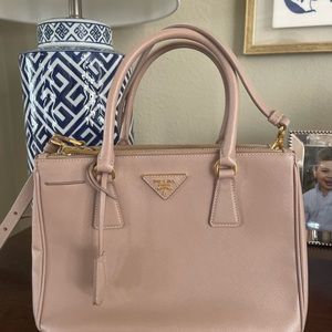 Authentic Prada Saffiano small galleria double zip tote in cammeo (blush). Retails for $4,100. Very good used condition. Comes with detachable shoulder strap. Open to offers. Would be super cute Valentine’s Day gift!