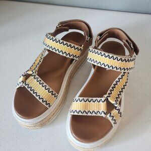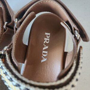 "EUC" Super Cute Platform Espadrille Sandals By Prada. Adjustable Velcro Strapping, Yellow, Cream & Black Textile Print Over Leather, Gold-tone Hardware, Almond Toe, Molded Cushioned Leather Foot Bed, Jute & Rubber 2" Platform & Extra-light Rubber Soles, Made in Italy, Great Condition, No Wearing on Uppers, Minor Scuffing/Markings to Soles, Worn Twice:)
