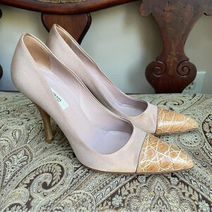 Gorgeous authentic Prada light blush pink/nude satin stiletto pumps in beautiful condition. Croc embossed leather at toe.