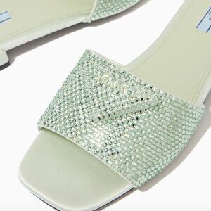 Prada Satin Crystal Embellished Acqua Slide Mules Sandals 37.5, 1XX642 NEW