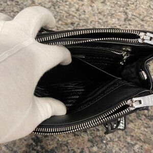 The Prada Satin Crystal Mini Galleria Double Zip Tote Metal is in good condition. It has signs of use on the strap where the buckle is in one of the loops. The bag itself is in good condition with no major signs of use. The interior of the bag is clean and free of odor. The exterior has minor scratches on the floor reset on the bottom of the bag. Over all the bag is in an (A) condition. It comes with dustbag and box.