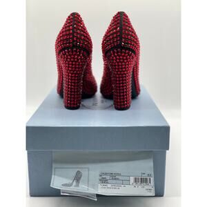 These stunning Prada pumps are the "Cristal" style in the vibrant "Rubino" color. The shoes feature a round toe and a block heel, entirely covered in sparkling red crystals. This style is often referred to as a modern "ruby slipper".