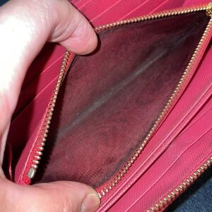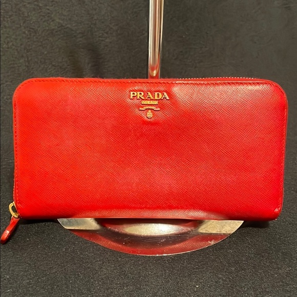 Chic Prada wallet in vibrant red. Features gold logo accent. Perfect for stylish organization.