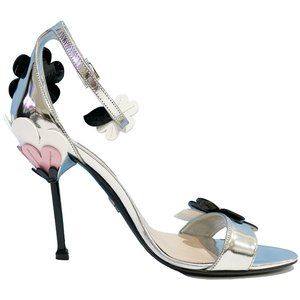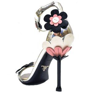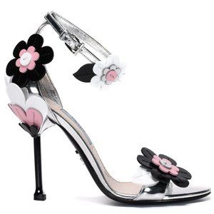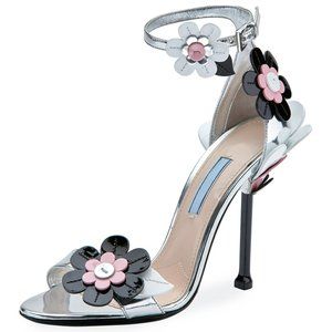 Prada mirrored and patent leather sandal with floral applique.