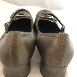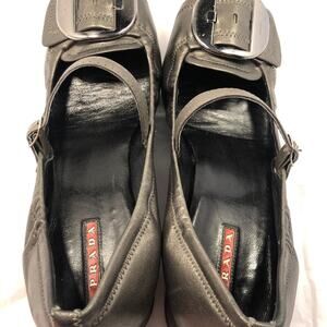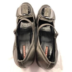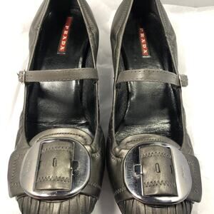 Excellent condition! Prada pre-loved and ever so in style silver leather stacked block heels with silver buckle detail. Adjustable ankle strap for comfort. Great this season and beyond! You can wear these preppy or with funky twist. LOVED these shoes! Box and dust bag not included.