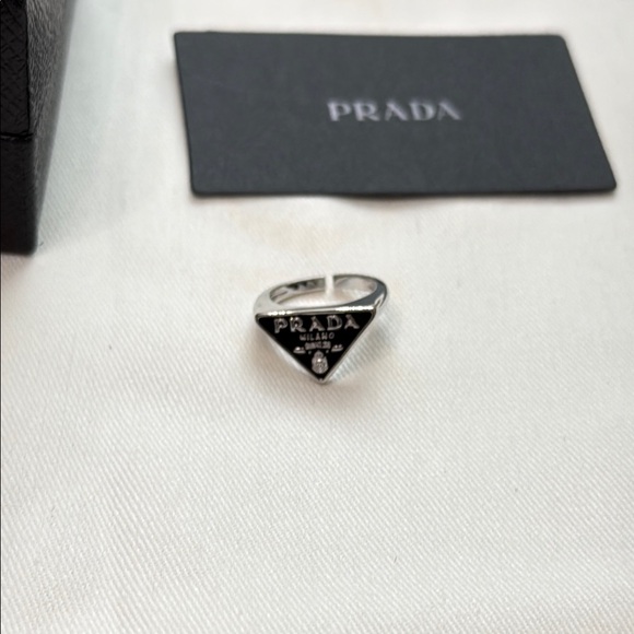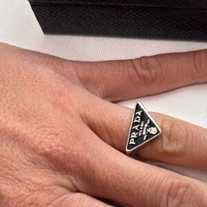 This Prada ring features a striking triangular design crafted in silver, embodying a modern and sleek aesthetic. The geometric form is enhanced by the iconic Prada logo, making it a luxurious addition to any jewelry collection. Its clean lines and distinctive shape ensure it stands out as a statement piece.