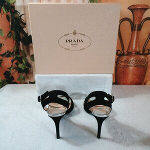 These are 100% authentic Prada sandals, a rare find featuring the highly sought-after iconic "Lip" design from the Spring/Summer 2000 collection. These vintage heels showcase a striking two-tone aesthetic, combining black suede and mirrored silver metallic leather. Designed with an open toe and an elegant ankle strap with a buckle closure, they offer a secure and sophisticated fit. The chic stiletto heel and unique upper design make these the perfect statement shoe for formal events, evening parties, or any cocktail occasion. They are a European size 40 (verify US conversion) and come complete with the original box and dust bag as pictured.