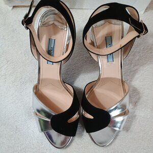 Prada Size 40 Black & Silver Iconic "Lip" Design Ankle Strap Heels