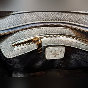 Chic Prada satchel in sky blue leather. Features elegant gold accents. Perfect for stylish outings.