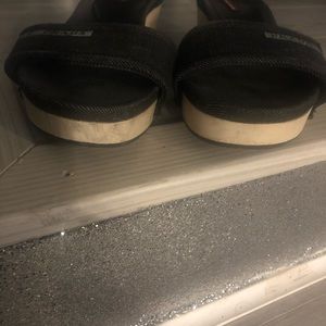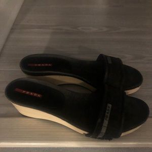 Black denim Prada slides, shows some signs of wear but still in good condition. No box or dust bag, lost when I moved. 100% authentic Prada, purchases years ago from Prada store on Fifth Ave when I lived in New York.