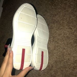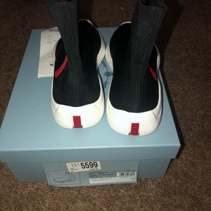 In GREAT condition. Purchased less than a week ago. Worn once. Fits like a glove, size 36 fits for 6.5/7 women. Prada runs a bit big i am usually a 6.5-7 in women. All black with white soles, Red Prada label on outside of each foot.