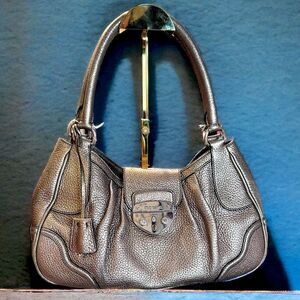 Good used condition leather handbag with original authenticity card. Corner wear as pictured. Interior clean with a small spot as pictured. Still has key for lock. Silver hardware on a metallic leather bag. The color blends the leather wear really well making this a very nice piece. Some fraying on handles as pictured.