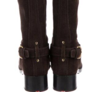 Prada Sport brown suede knee-high boots with round-toe, buckle accents sides and stacked heels. Authentic. Originally purchased from TheRealReal. Great preowned condition. Light scuffs at soles; minor wear at insoles; light blemishes throughout leather.