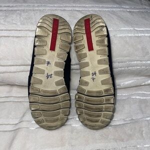 The luxurious mesh and neoprene fabric construction makes these sneakers extremely comfortable to wear. The shoes feature round toes, leather insoles, and durable rubber soles for lasting wear. Classic red Prada Sport branding on the soles. Good preloved condition Please see all photos