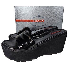 Tags: Prada sandals, black wedges, platform sandals, patent leather shoes, designer footwear, luxury wedges, Prada box, stylish sandals, rubber soles, women's wedges, elegant footwear, cushioned footbed, leather strap