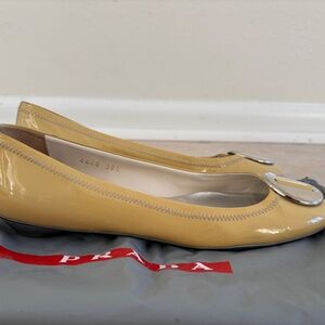 Prada Sport flats. Patent leather. Color: butter yellow with silver metal buckle. Greyish silver sole. Good tread. Some visible scuff marks. Euro size 38.5. US size 8-8.5.
