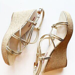 Prada Sport Gold Leather Platform Espadrille Wedge Sandals, Size 10.5