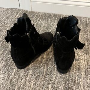 Black suede uppers with zipper details and Velcro straps. With a hidden wedge and a textured rubber sole, these sneakers are perfect for all-day wear. So comfortable - feels like a sneaker
