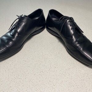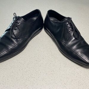 The shoes are the Prada lace up Derby in Soft Black Oiled Leather.