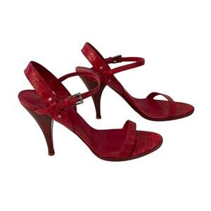 Strappy Croc-Embossed Leather Sandals by Prada. EUC. No flaws or stains. Step out in bold, elevated style with these authentic Prada strappy sandals in striking red croc-embossed leather. Featuring a 4.5-inch stiletto heel, slim crisscross straps, and an elegant open toe, these sandals deliver both sophistication and edge. The rich texture and vibrant color make them the perfect statement piece for evening wear, events, or fashion-forward summer looks. Size 39 (fits like a US 9). Made in Italy with Prada’s signature craftsmanship.