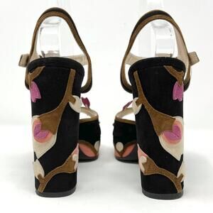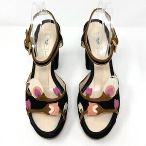 Keywords: Prada platform sandals, floral appliqué heels, suede 70s sandals, statement heels, vintage Prada, runway heels, collector shoes, Italian designer platforms, Prada made in Italy, vintage Prada, Retro Prada, statement shoes, rare Prada shoes.