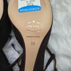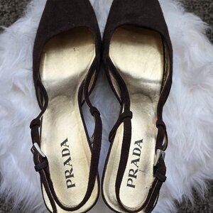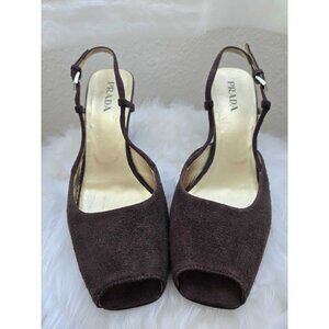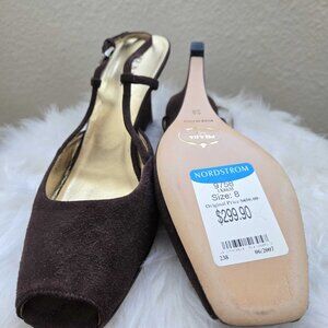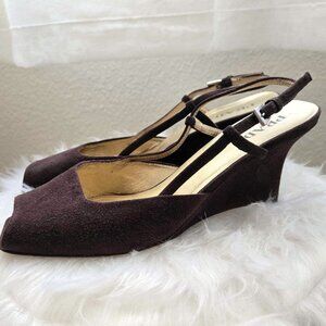 Size 8 rich brown suede and leather slingback sandals with buckles made in Italy. 3" tall skinny wedge style