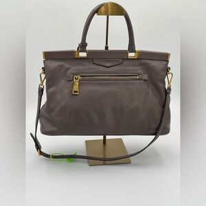 Sophisticated Prada taupe two way leather tote bag with elegant gold hardware. Features two zipper pockets on either sides which one is lockable. One zipper pockets and two small pockets inside, includes a stylish detachable strap. lock and key included.
