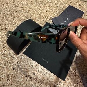 Elegant Prada sunglasses with a green and black frame. Includes branded case and cloth. Gently used IN MINT CONDITION