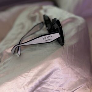 Authentic Prada Symbole sunglasses in the chic oversized square style (model SPR 17W). Features glossy black frames with bold white temples engraved “PRADA MILANO” in silver. Gradient black lenses offer full UV protection while adding a sleek, high-fashion finish.