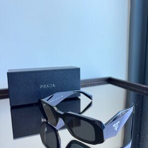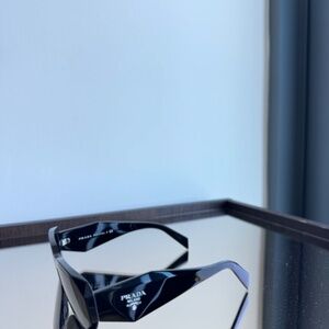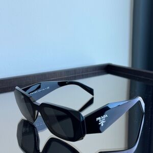 Acetate sunglasses with an oversized, geometric design. The bold frame front has an avant-garde silhouette defined by the extreme angled cut of the outer corners. The three-dimensional design of the temples is decorated with an iconographic interpretation of the traditional Prada triangle logo.