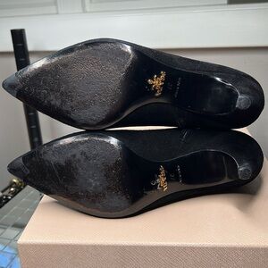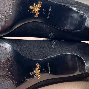 Prada Sz 7 Black Short Suede Kitten Heel Ankle Zip Pointed Toe 2” Heel Booties