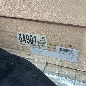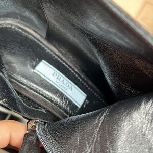 This is a beautiful pair of Prada Sz 7 Black Short Suede Kitten Heel Ankle Zip Pointed Toe Booties. Will come in original box, shoe bags, etc. A small nick on the bottom back of the heel, hardly noticeable. Part of the gold logo underneath the right boot has broken off can easily be repaired and replaced at no cost at Prada. No odors. Full leather interior. 2” heel