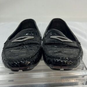 This is a beautiful Prada US 9.5 Sz40 Black Crocodile Embossed Patent Leather Driving Moccasins. Excellent pre owned condition. Chrome logo’d hardware. Extra padded leather interior. Normal slight signs of wear. No odors. No stains
