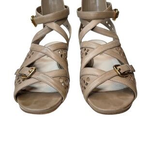 Prada Tan Leather Ankle Strap Gladiator Sandals / adjustable ankle strap buckles / gold hardware / has box / size 36 1/2 / Condition: Great preowned condition